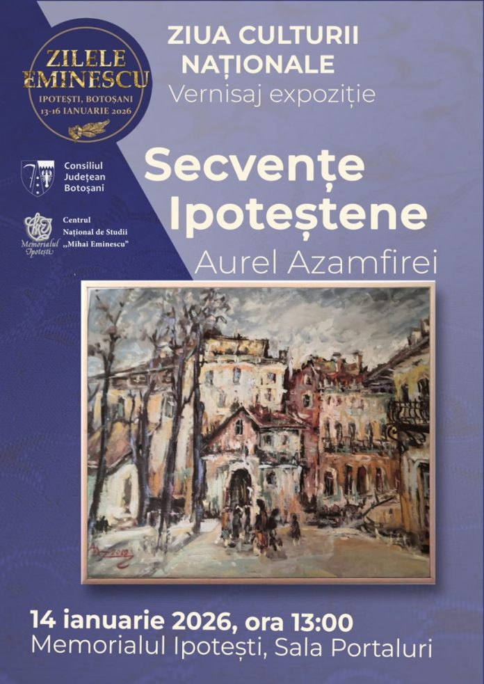 Memorialul Ipotești – Centrul Național de Studii „Mihai Eminescu”, instituție aflată în subordinea Consiliului Județean Botoșani, vernisează expoziția Secvențe ipoteștene a artistului plastic Aurel Azamfirei.