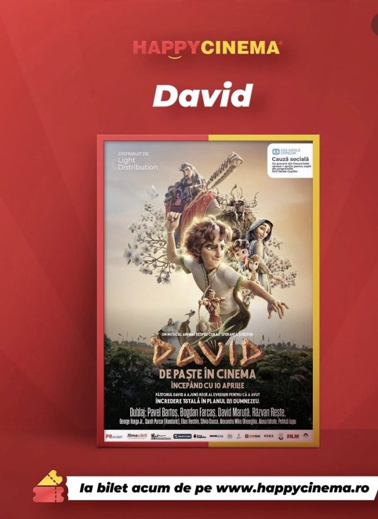 „David” – o animație spectaculoasă care readuce la viață una dintre cele mai cunoscute povești din istorie. Urmărim drumul unui tânăr păstor din Betleem, aparent obișnuit, dar ales pentru un destin extraordinar. În fața amenințării uriașului Goliat, David își găsește curajul nu în forță, ci în credință și determinare.